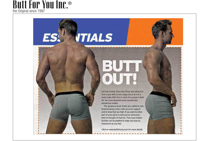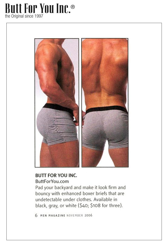 ![]() | MEN USA, November 2006 Pad your backyard and make it look firm and bouncy with enhanced briefs that are undetectable under clothes...(read more) | ![]() | GCN Ireland, July 2006 Let's be honest, there few things less attractive than a guy with no ass; saggy jeans do not a hunk make...(read more) |