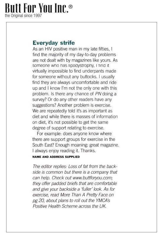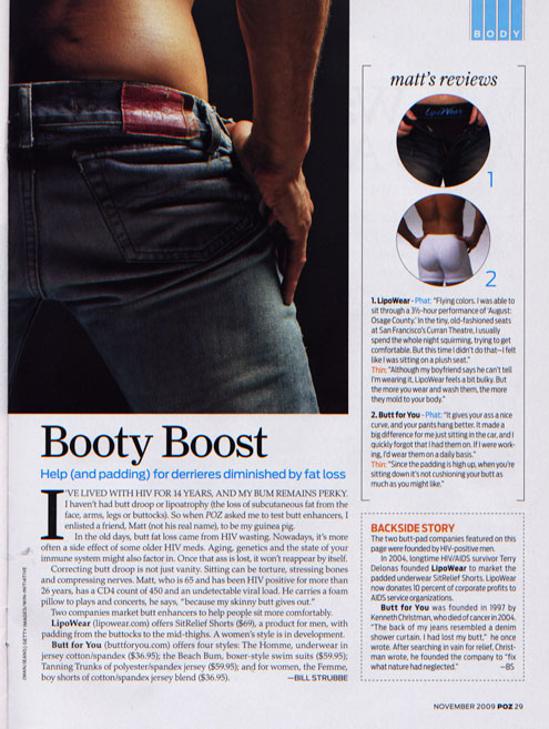 ![]() | POZ UK, May 2006 As an HIV man in my late ffties, I find the majority of my day-to-day problems are not dealt with by magazines like yours. As someone who has lipodystrophy, I find it virtually impossible to find underpants made for someone without any buttocks....(read more) | ![]() | POZ USA, March 2005 Once upon a time, I had a butt. But that was before HIV meds - especially Zerit - melted it way three years ago. I didn't have 10-grand-plus to correct this fat wasting, so I found a kick-ass backup: underwear with butt pads...(read more) |